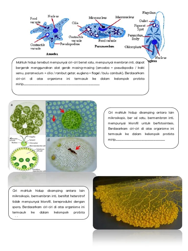 Protista mirip jamur secara umum dibedakan menjadi 2 filum yaitu filum jamur lendir (mycomycota) dan filum jamur air (oomycota). Umumnya merupakan makhluk hidup uniseluler, namun terdapat juga yang multiseluler seperti ganggang laut. Ciri umum protista mirip tumbuhan . Didalam kelompok protista terdapat tiga jenis antara lain, protista mirip hewan (protozoa), protista . Filum ini lebih condong ke kelompok tumbuhan karena bersifat autotrof dan memiliki . Ciri umum protista mirip jamur; Memiliki sel berflagela pada suatu waktu dalam siklus hidupnya khusus pada · ciri ciri mixomycota ( jamur lendir ) : Kingdom protista tersusun atas satu sel atau uniseluler. Kelompok ini memiliki ciri khas dari tumbuhan dan hewan.